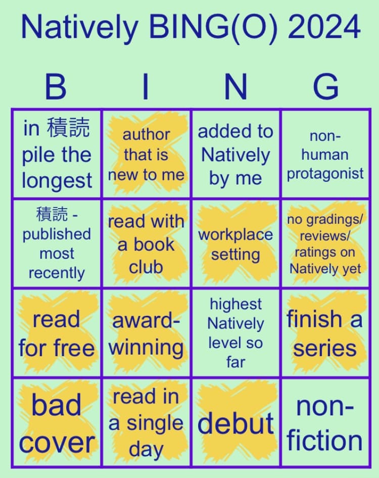 Since I just pick up stuff I think could be interesting or enriching I already dread having to scrub through everything for the “published the year you started learning Japanese” and “debut work” squares…