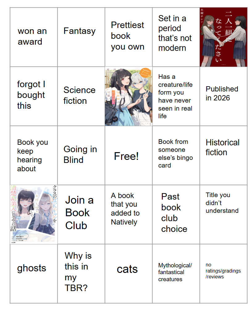 Plan is to finish some series I started in 2025 for bingo and other books and really push reading more LNs…2025 had planned on reading more LNs but I’m just so slow…