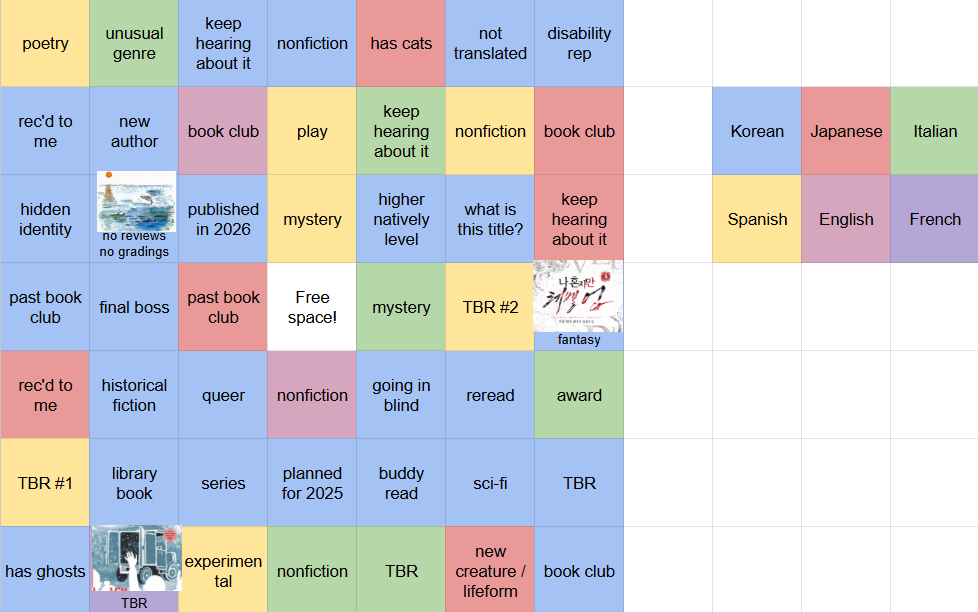 After much deliberation, I think I’ll be going with this multi language bingo! With three languages I’m actively learning (Korean, Japanese and Italian), one I’m maintaining (Spanish), and then French and English to fill some spaces and give me more motivation to get through certain books. I’ve changed quite a few prompts, but I’ve decided to go with something where most of the prompts aren’t too specific, so that I won’t have to go scouring for books that fit them. I’ve gone with 26 korean prompts for 2026, and then with the rest, I split it with 7 for Spanish and 6 for Japanese and Italian. And of course, a free space, for any language that isn’t French or English.