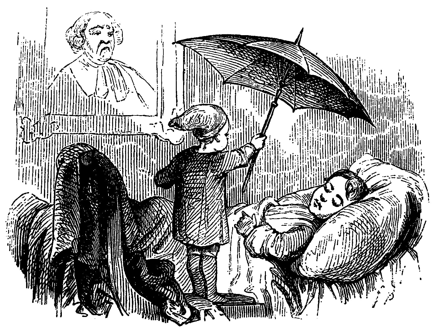 There is nobody in the world who knows so many stories as Ole-Luk-Oie, or who can relate them so nicely. In the evening, while the children are seated at the table or in their little chairs, he comes up the stairs very softly, for he walks in his socks, then he opens the doors without the slightest noise, and throws a small quantity of very fine dust in their eyes, just enough to prevent them from keeping them open, and so they do not see him. Then he creeps behind them, and blows softly upon their necks, till their heads begin to droop. But Ole-Luk-Oie does not wish to hurt them, for he is very fond of children, and only wants them to be quiet that he may relate to them pretty stories, and they never are quiet until they are in bed and asleep. As soon as they are asleep, Ole-Luk-Oie seats himself upon the bed. He is nicely dressed; his coat is made of silken fabric; it is impossible to say of what color, for it changes from green to red, and from red to blue as he turns from side to side. Under each arm he carries an umbrella; one of them, with pictures on the inside, he spreads over the good children, and then they dream the most beautiful stories the whole night. But the other umbrella has no pictures, and this he holds over the naughty children so that they sleep heavily, and wake in the morning without having dreams at all.