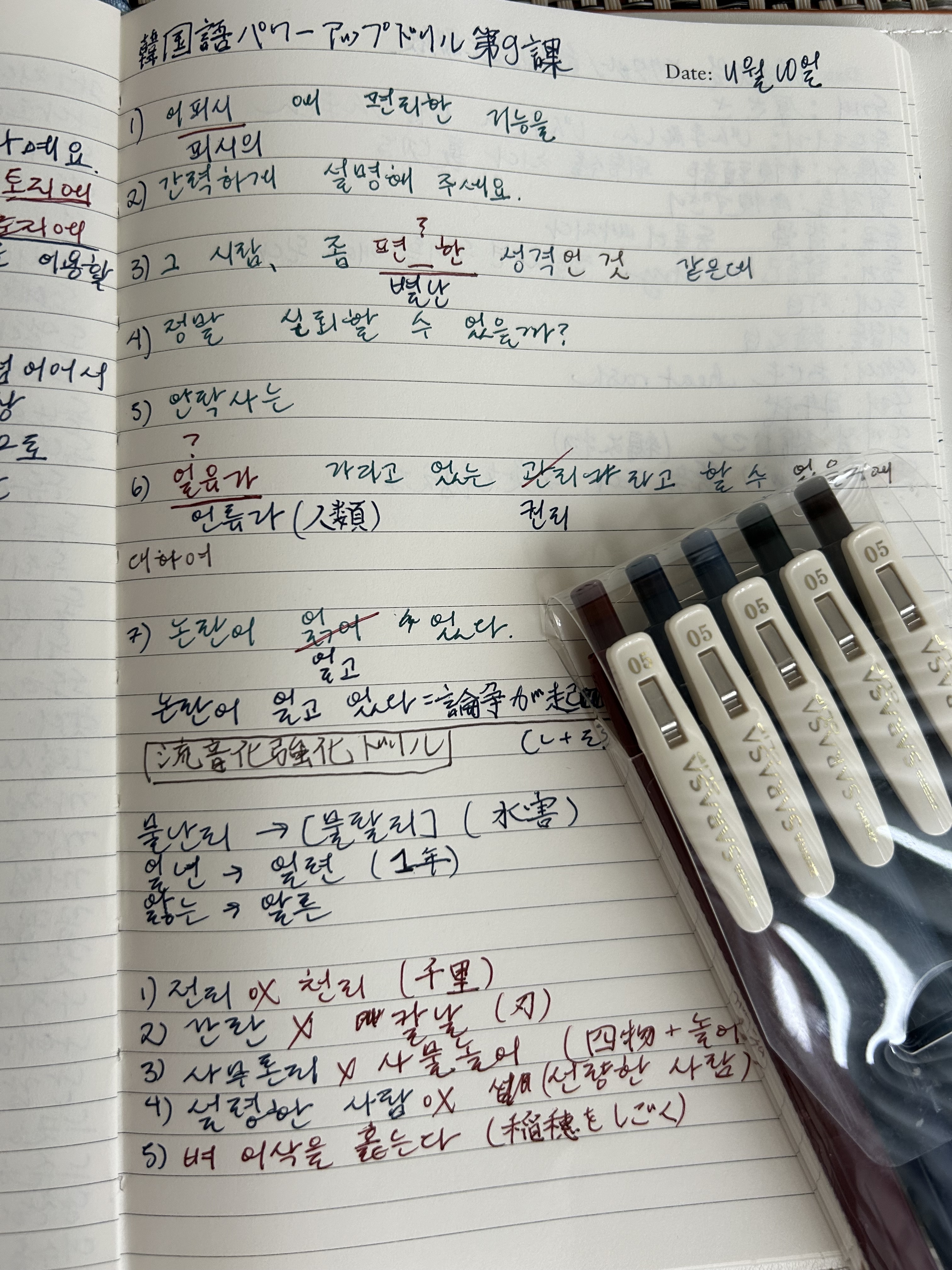 When I started learning Korean in 2022 it became kind of a pet project for me to take the lessons I learned from getting to a high level in German and Japanese and apply them to learning a new (difficult) language completely from scratch, outside of the country with no guidance from a teacher. It’s also a way for me to de-stress from my job and from learning Japanese (having more than one hobby is good!). So, I’ve been trying to take only the parts that are the most fun for me and then combine them with things that helped me learn in the past, but in a more efficient way. That has ended up looking like a lot of writing by hand using fun pens and paper and textbooks with exercises that both present me with a linear path of improvement and let me get a sense of accomplishment everyday (this helps with de-stressing from work too).