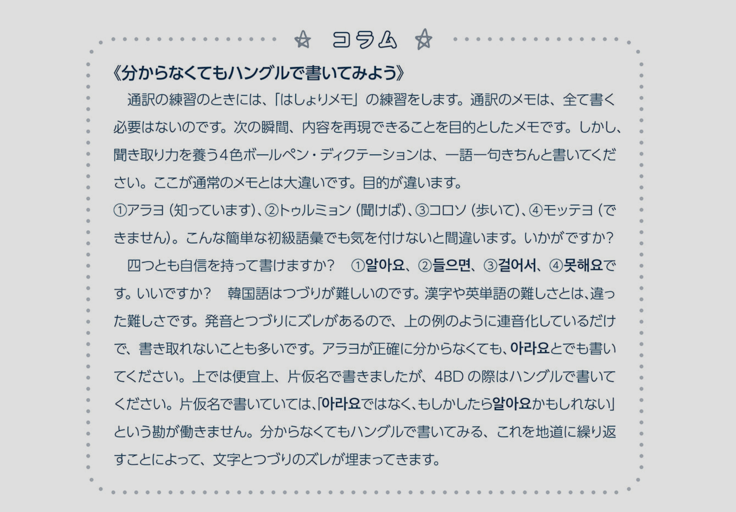 Right after that, though, there was a column from the author explaining how interpreters take notes, tying that to the lesson, and encouraging learners to try and write down what they hear as best as they can, even if the spelling is incorrect. Only by doing so can you find the gaps in your knowledge and fill them!