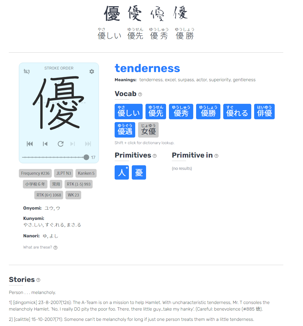 Whenever I have a word in my reviews or new cards for which I’m not too sure about the kanji I can have the extension create a set of cards for all the ‘primitives’ and the kanji itself, which include all the words in my vocab decks that include these kanji. There are RTK style stories included on the back of the cards, but they are from that one site I don’t know the name of, which means sometimes they are kinda…