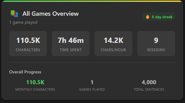 visual novels I love them as a medium and now that I setup gsm they feel like such a good way to mine new words. I also love having all the stats to look at and see progress.