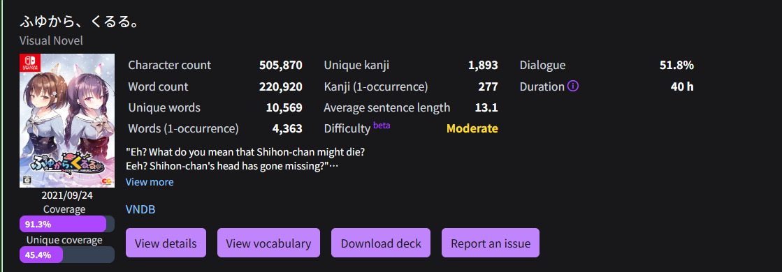 Anyway this tells me to continue to aim for this sweet spot. I’ve been looking through jiten to see if there are any other vns that I am already interested in that are around 90 percent coverage. Which gave me…