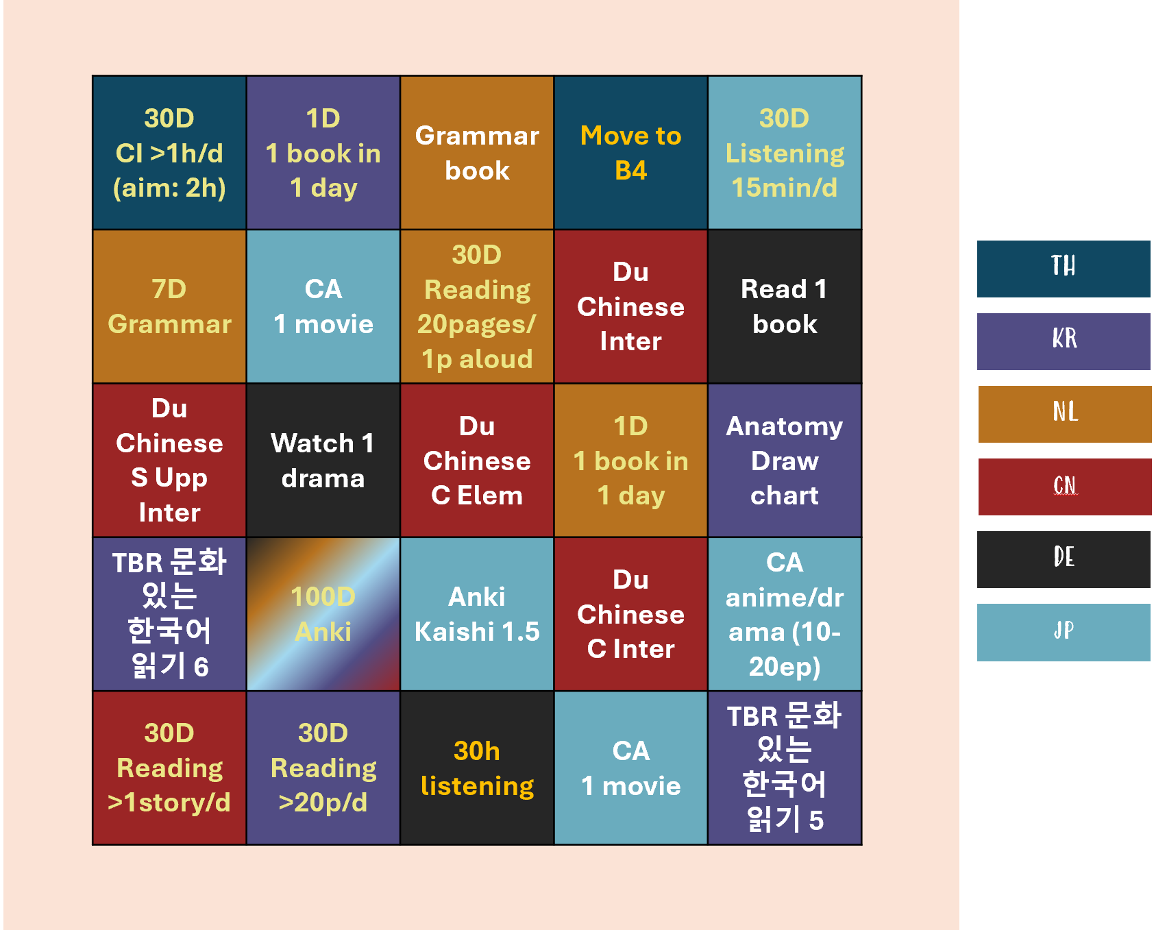 I’d like to put more practice into translating. I already do it a bit (like maybe a short section of whatever I’m reading), so I guess I’m thinking of maybe expanding this. Like with listening goal, I have some concrete goals.
