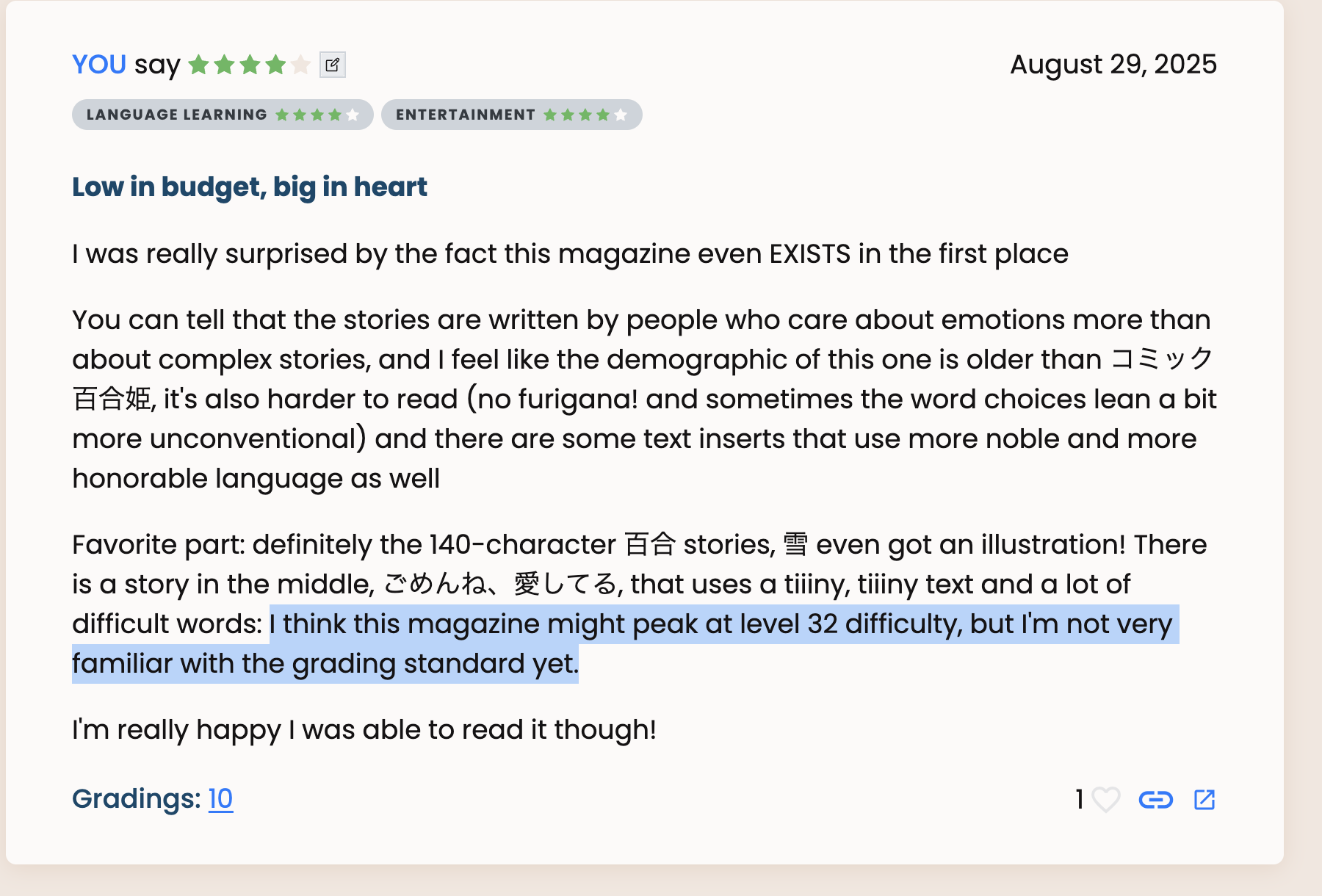 One thing that I thought of that probably contributes to my confusion about ratings is that I like learning much more than reading, so if I learned a lot of Japanese from a novel (which has been all of them so far tbh), it automatically was fun and worth reading. But as a lot of you said, it’s mostly subjective so I won’t sweat it and just expand in reviews if needed!