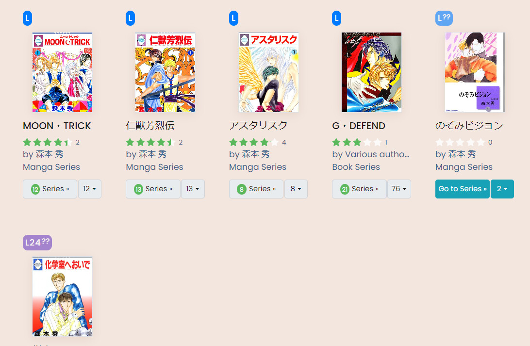 Odd bug I think is related to the infrastructure changes: searching by 森本 秀 (specifically by clicking on the author tag on a book to see all the books the author has written) brings back a book search page with no levels for most of the results: