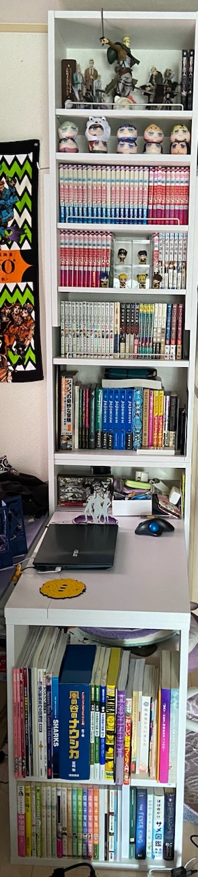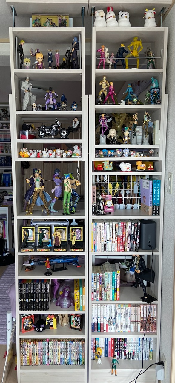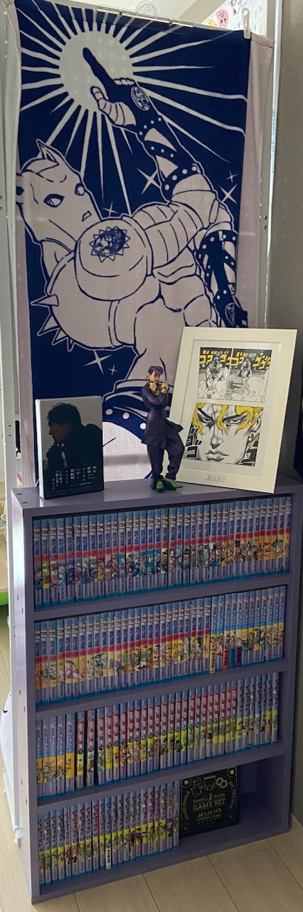 I arranged these two shelves so that they don’t get much direct light in order to help preserve the colors of the jackets. The first pic is all first edition JoJo volumes.