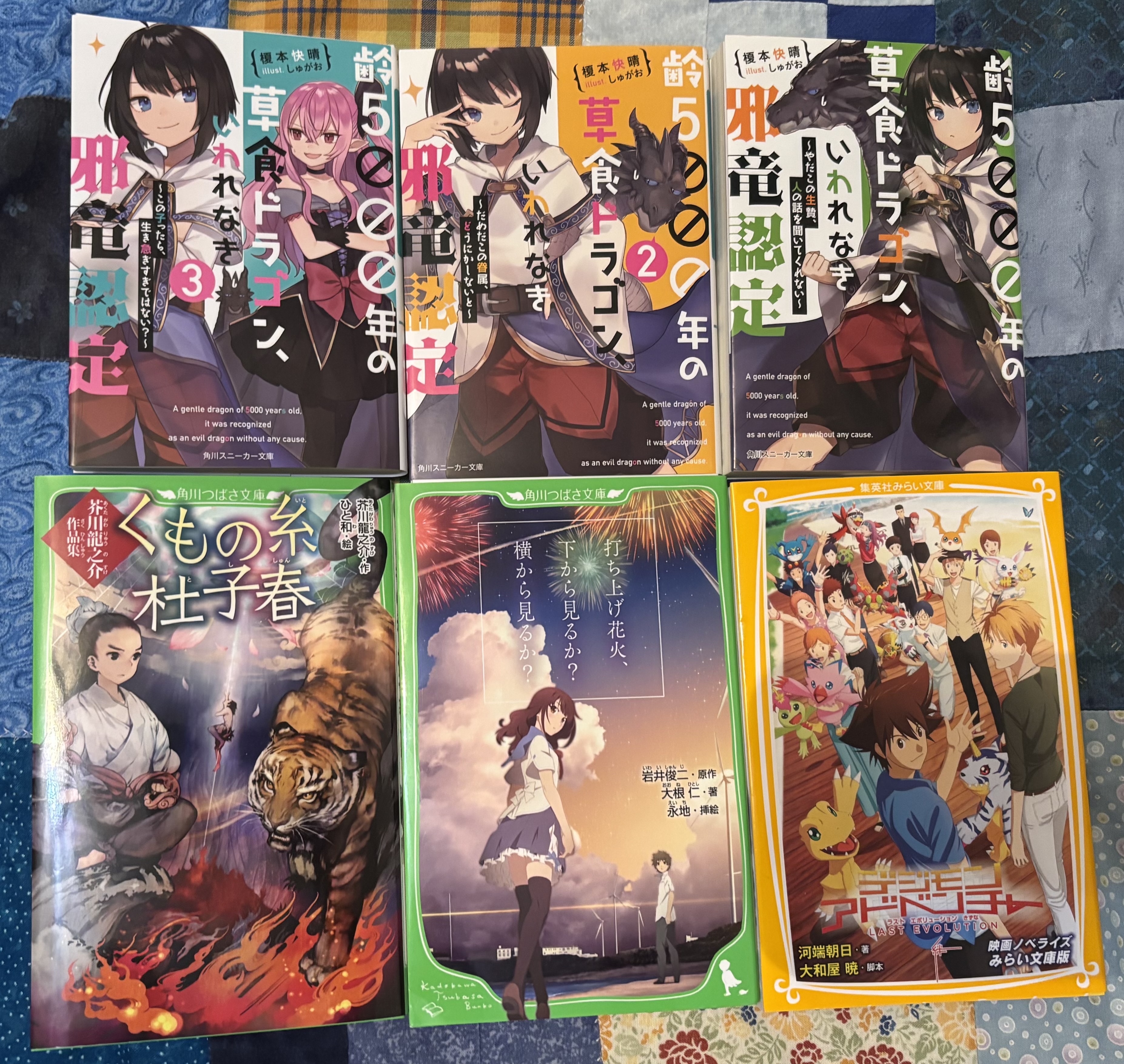 Bottom three from left to right: くもの糸 and other short stories because I have abridged version of the stories or know them in English and wanted to read them in Japanese. 打ち上げ花火、下から見るか?横から見るか? bought this on a whim. デジモンアドベンチャー LAST EVOLUTION 絆 映画ノベライズ みらい文庫版 and this one too. Surprised this is my first Digimon book considering I’ve got most of the UK released games across several different consoles.