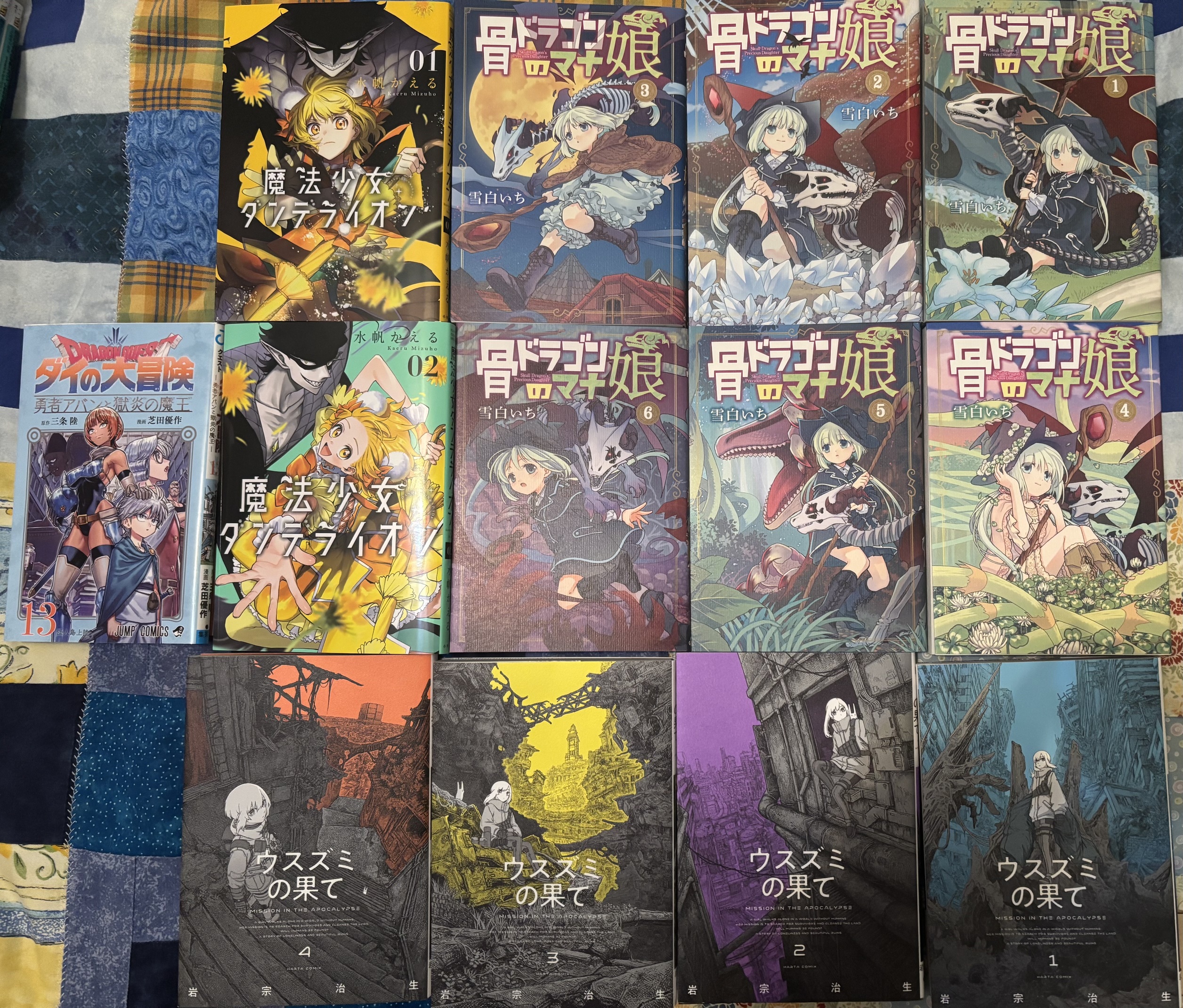 mid left, most recent volume of ドラゴンクエスト ダイの大冒険 , 魔法少女ダンデライオン manga as I liked the sound of the characters, 骨ドラゴンのマナ娘liked the look of these covers and the fact there is an additional manga page or two under the covers.