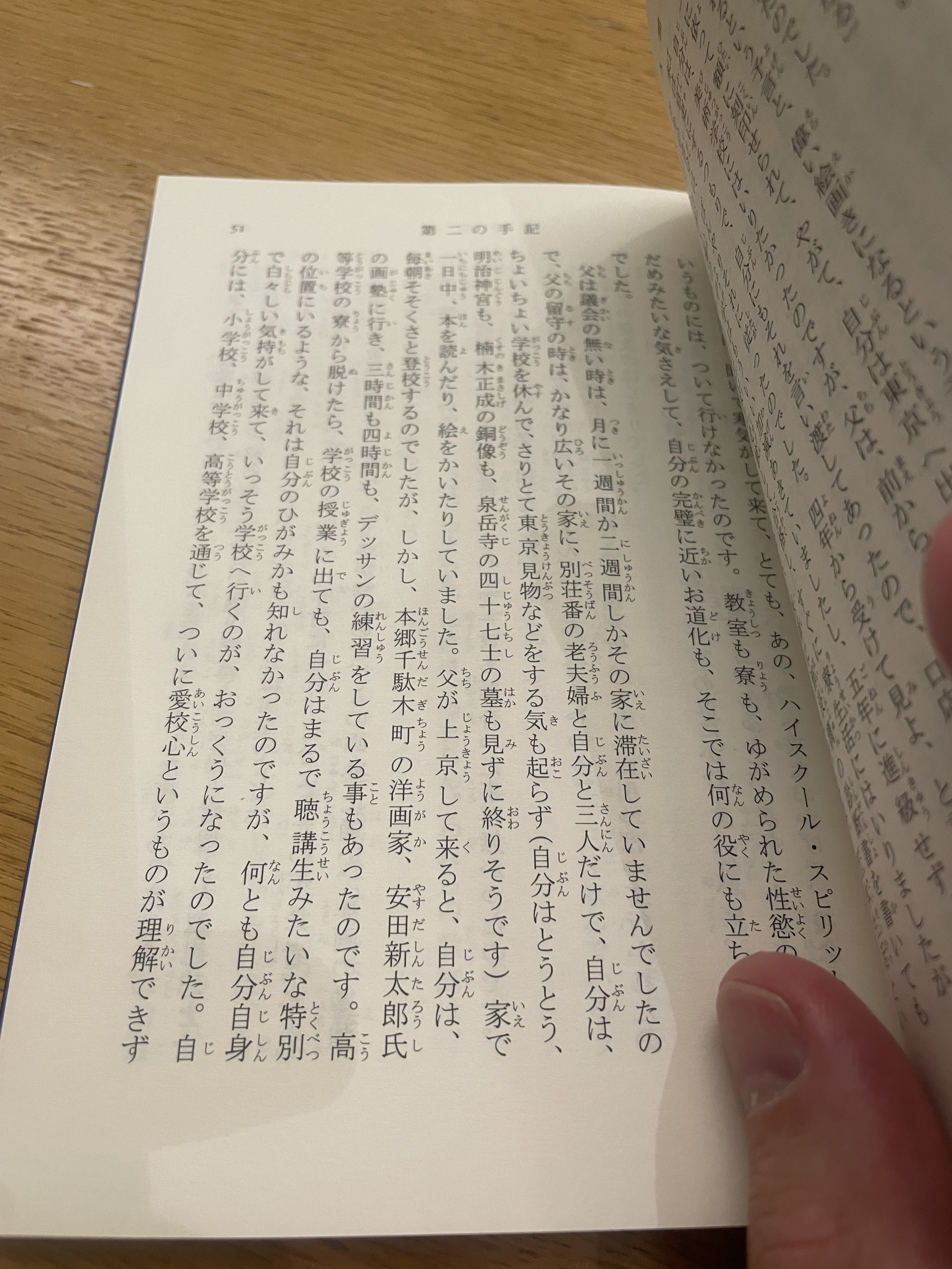 For 人間失格 it’s just full furigana, which is a pretty handy way of making it a bit smoother for me to read. (Although I do wonder if the furigana on obvious stuff, 私、父 etc. will end up being annoying). In any case, kinda interesting that it exists!