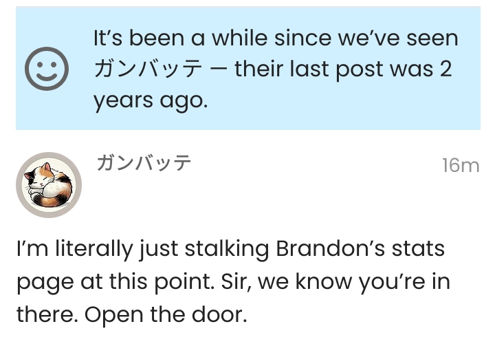 I’m literally just stalking Brandon’s stats page at this point. Sir, we know you’re in there. Open the door.