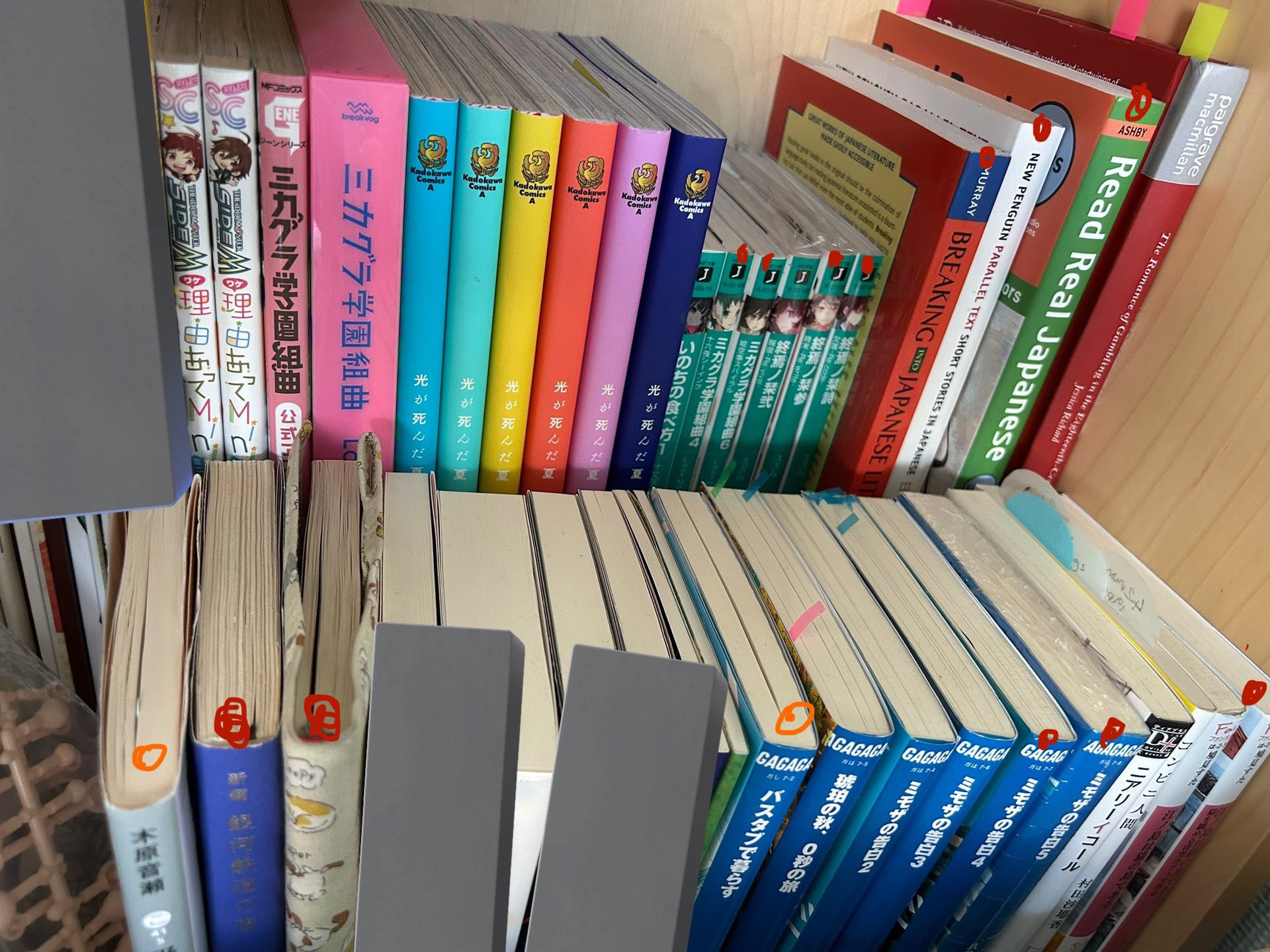 Here is my image of shame for the physical books (going to focus on traditionally published books, so covered up the doujin even though there’s a couple I still haven’t read). Red dot above the book means I haven’t read it, orange means I either started reading it and just kinda stopped (the one on the left) or DNF’d it (the one on the right).