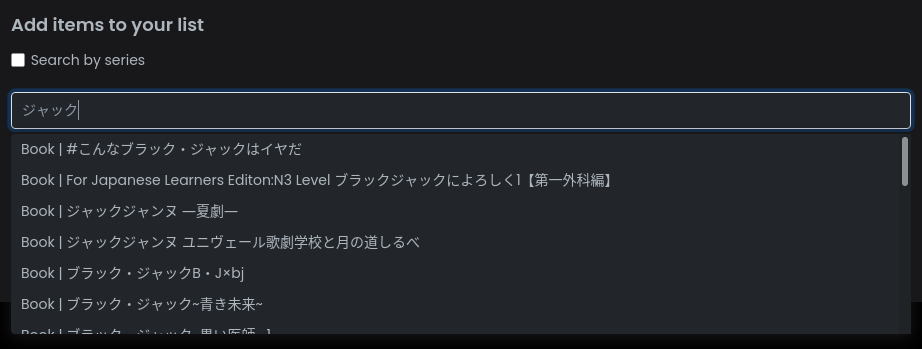 It seems like the search in lists searches only from the start of the title, and not within the title. So “ブラック・ジャック” won’t turn up that book, but “小説 ブラック” will