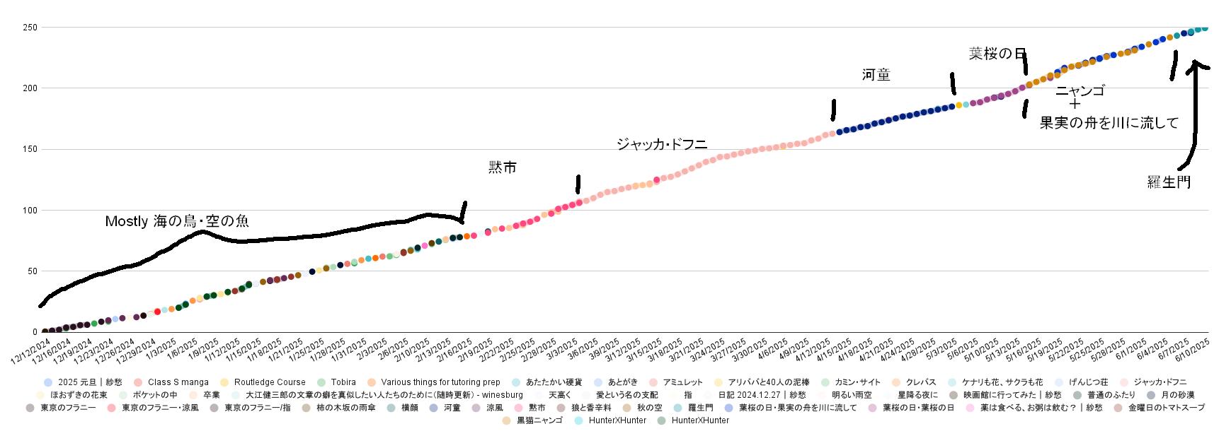 Anyways, I came across a book with a chapter titled “Autofiction and the Shishosetsu: Women Writers and Reinventing the Self” within which there was an analysis of the 鷺沢萠 book 私の話. This isn’t translated to English, and because I had a lot of free time, I decided to buck up and learn the language by doing duolingo on and off for a couple of years - whoops. After the third or so time restarting I found the Tofugu grammar webpage and used that to get explanations (and then dropped it again).